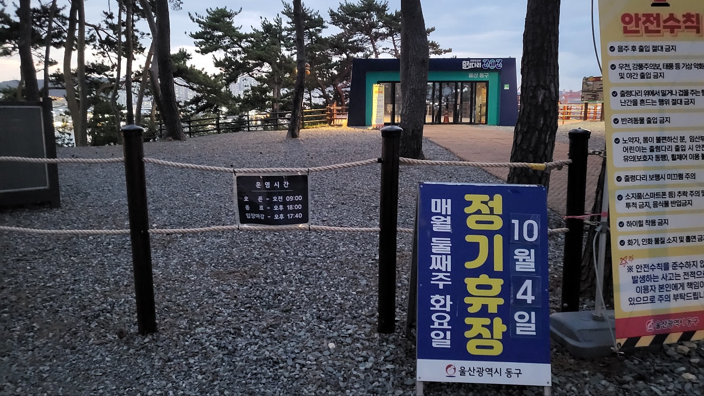 대왕암을 가려면 처음 마주치는 관문이 출렁다리입니다. 오후 6시까지만 개방을 하고 있으며 돌아 나오면서 보니 영업 종료를 알리고 있습니다. 바다 위에 위치하고 있어 위험하니 어두워 지면 입구를 막아 둡니다.